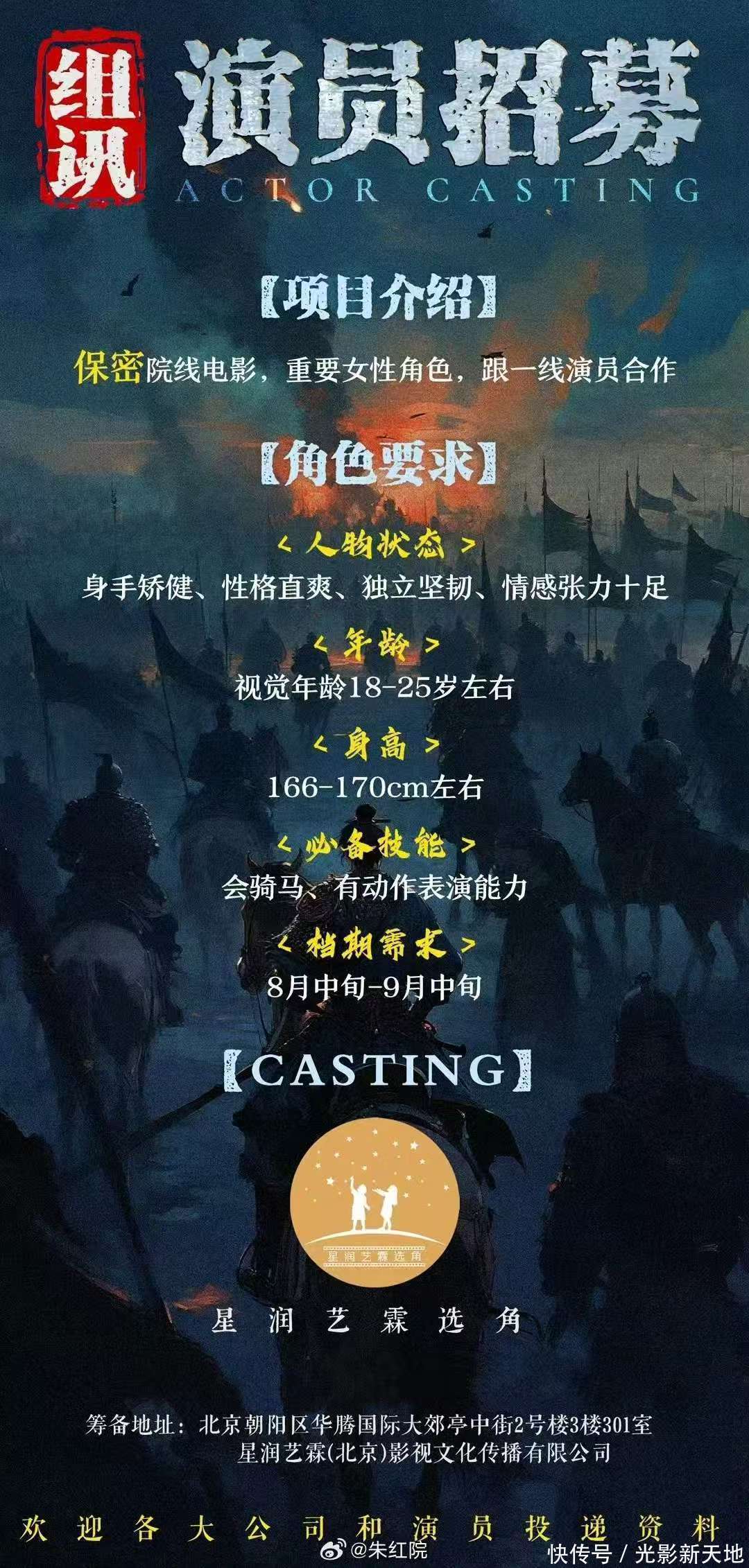 组讯写的档期需求是“8月中旬-9月中旬”,对了,星润艺霖选角亦然和吴京配合过《战狼2》的公司。
