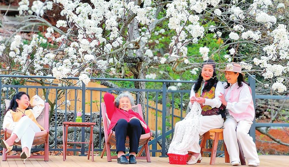 个旧城内,东说念主们在梨树下休憩。通信员李屏摄