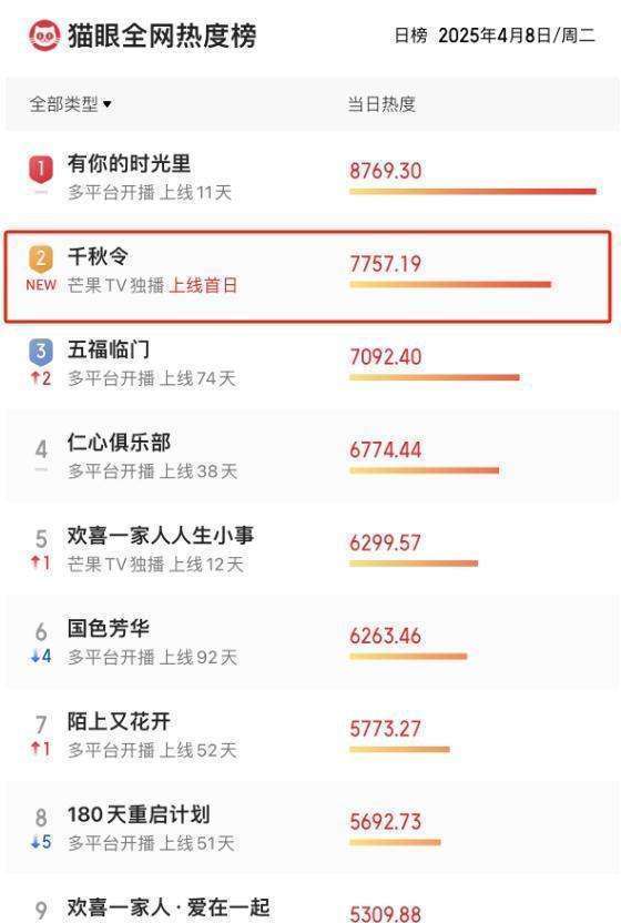 这部名叫《千秋令》的新剧,在芒果TV上线后,热度那是蹭蹭往高潮,首播就直逼童瑶的新剧。