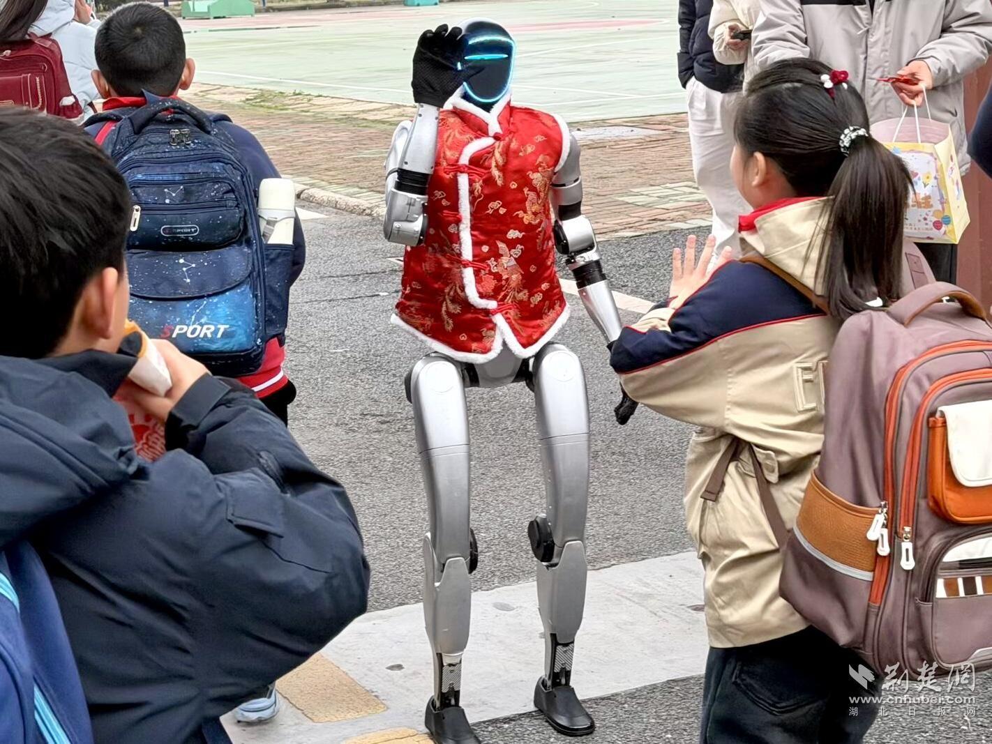 “科技润童心,善养启新程”,黎明的校门口暖意涌动,两位智能机器东说念主“迎新大使”当先登场,伴着欢快旋律挥手、舞蹈,全程参与升旗典礼,还在互动法度机智粗放,AI科技与患难之交童心碰撞,引得孩子们阵阵欢腾。