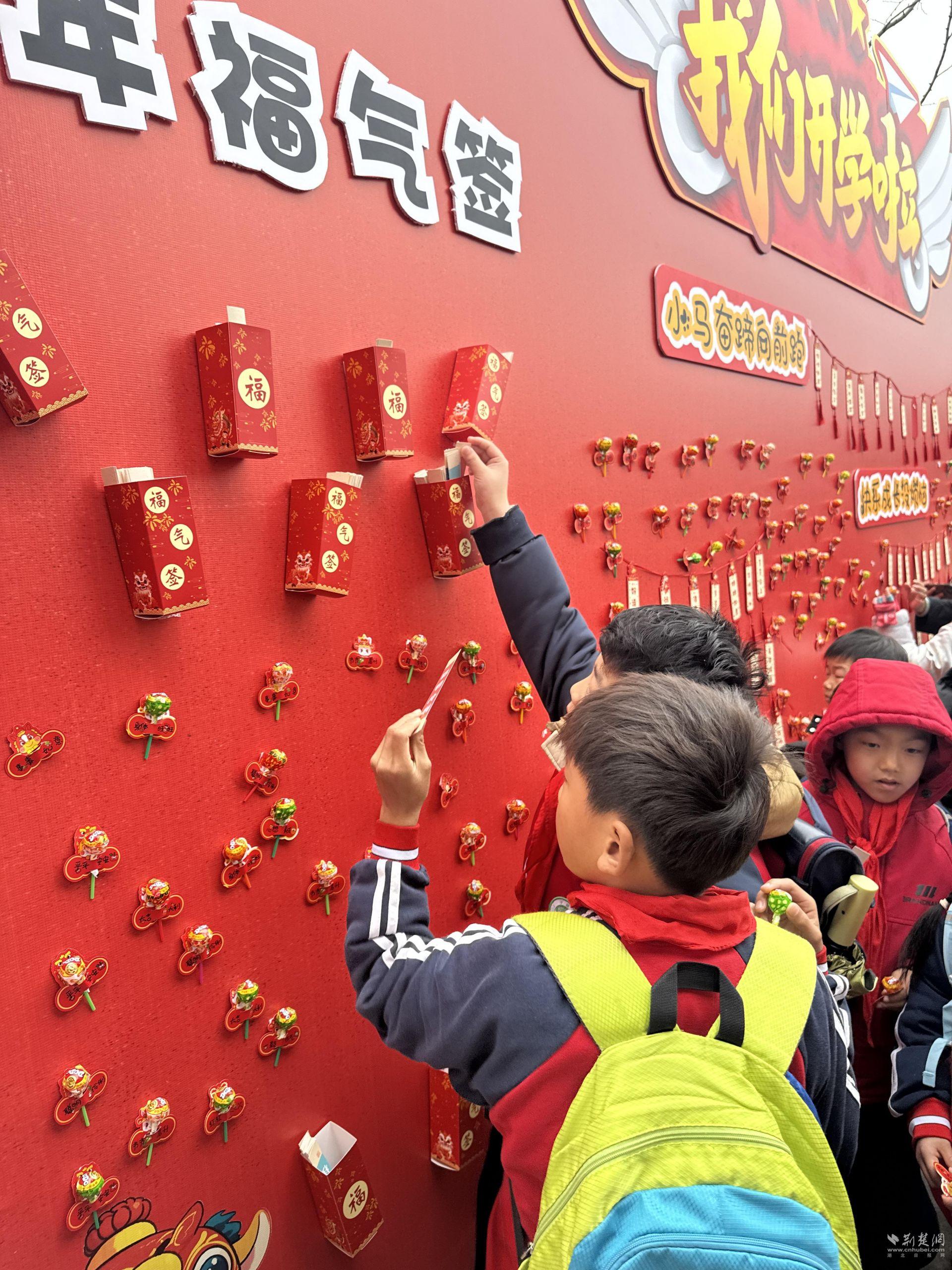 校园内,“咱们开学啦”主题打卡点东说念主气飞扬,同学们纷繁藏身,抽取专属我方的新学期福泽签,领取寓意甜密的棒棒糖,小小福签承载着校园的暖心祝愿,丝丝甜意请托着对学业跨越、好意思瞻念成长的好意思好期盼。典礼感满满的迎新法度中,同学们循序跨越印满祝颂的彩色跨栏,以激越姿态告别过往、欢迎新程;随后提起纸笔,崇拜写下成长传话与奋斗蓄意,珍惜粘贴在“心愿成马,奔腾而来”主题布景栏上,在实施中进修勇气、锚定场所,让精神焕发浸润童心。