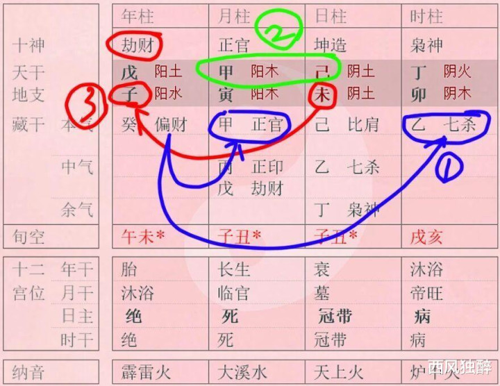 在八字中,天干的夫星为“明”,地支的夫星为“暗”。配头宫和子孙宫是命主我方家,命主我方家里住的是七杀,在暗处。但命主却跟不在家里的正官谄谀——家里有,外面还有。