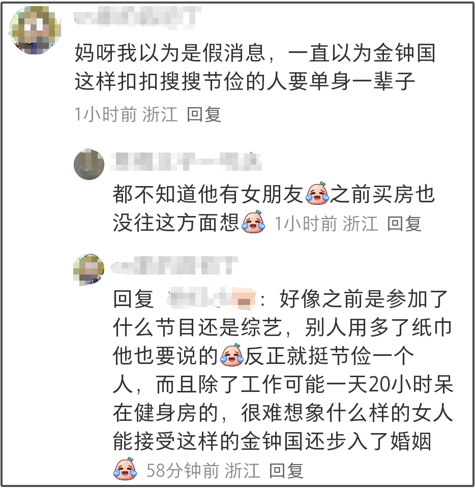 濒临熟识的明星出乎料想的成婚音信,网友诚然道贺更多,不外隐浮泛约也曾有些系念,因为金钟国多年来给东说念主印象除了体魄厚实,剩下最大的标签即是吝啬了,生涯风气一般东说念主很难符合。