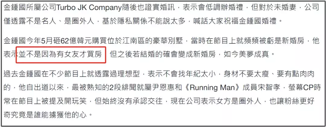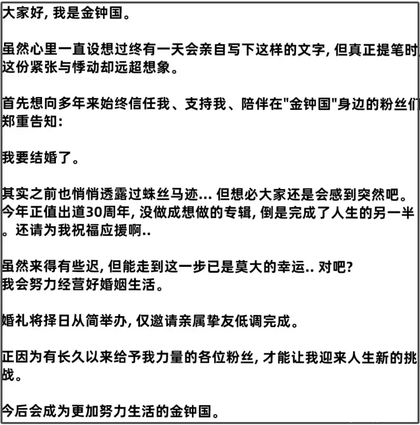 金钟国经纪公司则默示金钟国新婚夫人是圈外素东说念主,但愿外界不要过度惊扰。