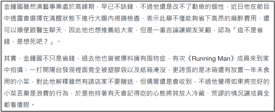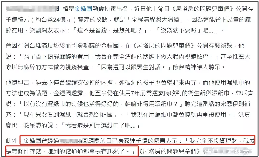 ——夏天不开空调、拖鞋只买均码、拒却使用湿纸巾、作念肠镜都要省麻醉……金钟国的吝啬并非皆备综艺东说念主设,相同受到原生家庭影响。