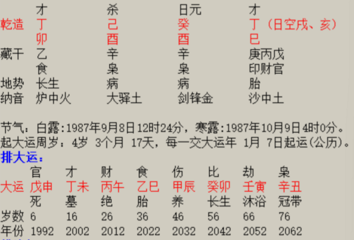 土的问题好经管,一方面是己酉一柱,酉有问题己土对应也会有些问题,另一方面是年柱丁卯生己土,被酉金克了,是以大运经管卯的问题就会改善。