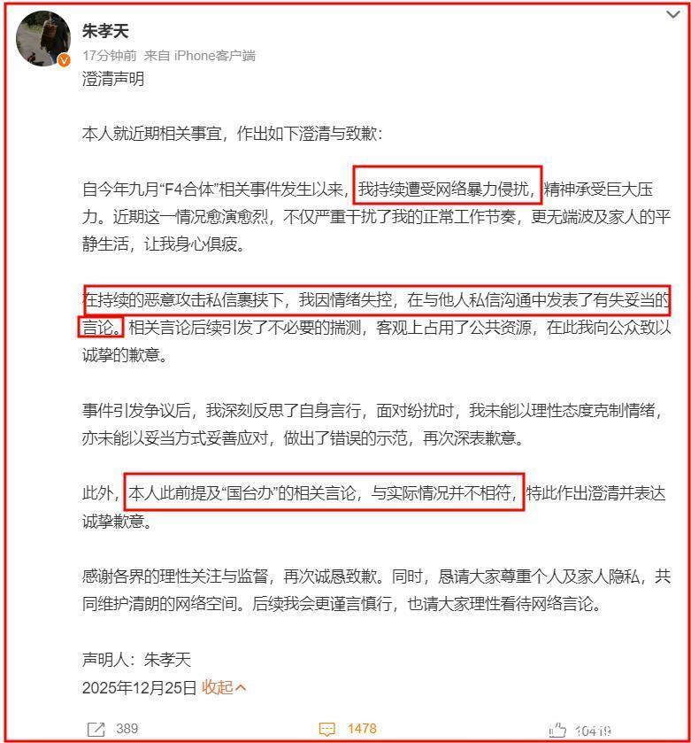 字据朱孝天的致歉长文可知,他说自从本年9月“F4合体”关联事件发生以来,他被执续网暴,思想包袱广泛,糊口和责任受到严重抵制,身心俱疲。