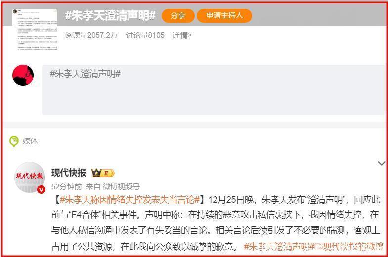 现时,朱孝天也曾发布了致歉长文。