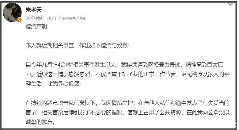 朱孝天暗示受“F4”合体争议事件影响,我方络续遭遇蕴蓄暴力报复后思想包袱过大,从而导致情谊失控在群内发布了失当的言论。