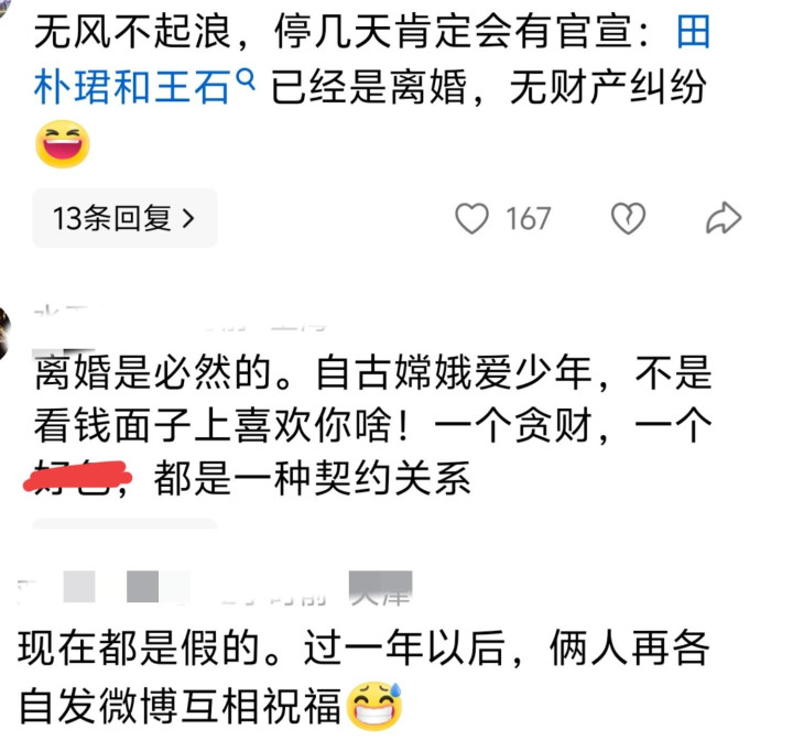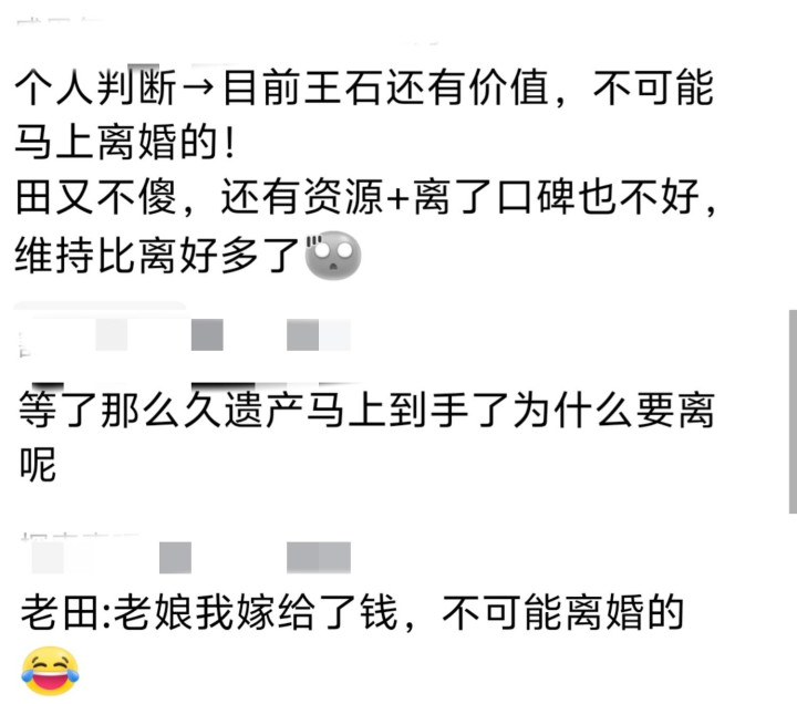 有网友说田朴珺不成能离异,嫁给大我方30岁的东说念主便是为了钱,王石的东说念主脉资源还有愚弄价值,而且还莫得罗致他的遗产。