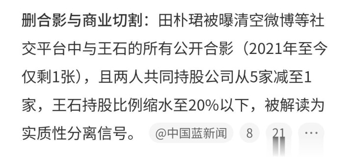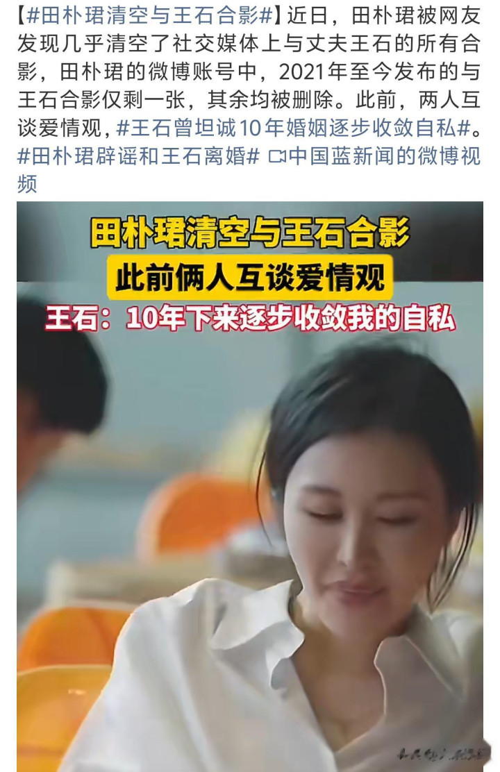 启事是有网友发现,田朴珺清空了酬酢账号上跟王石的合影,只留了一张。之前两东说念主在节目上语言的时候也说剑拔弩张,氛围很奇怪。田朴珺又在元旦节新年第一天发了疑似复原未婚的案牍,“翻至新鲜章节,让过往千里淀为阶”。