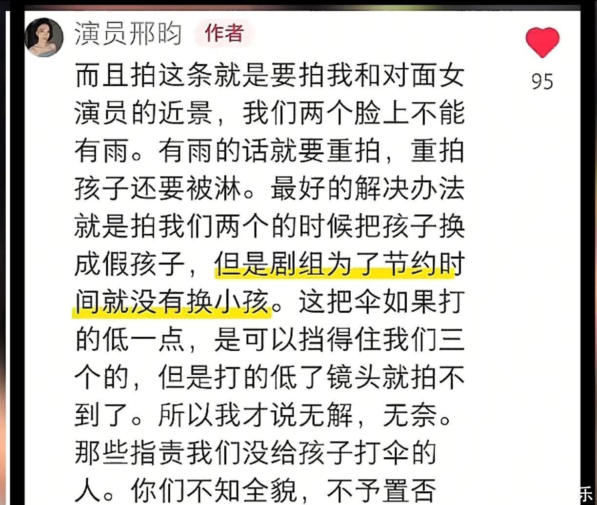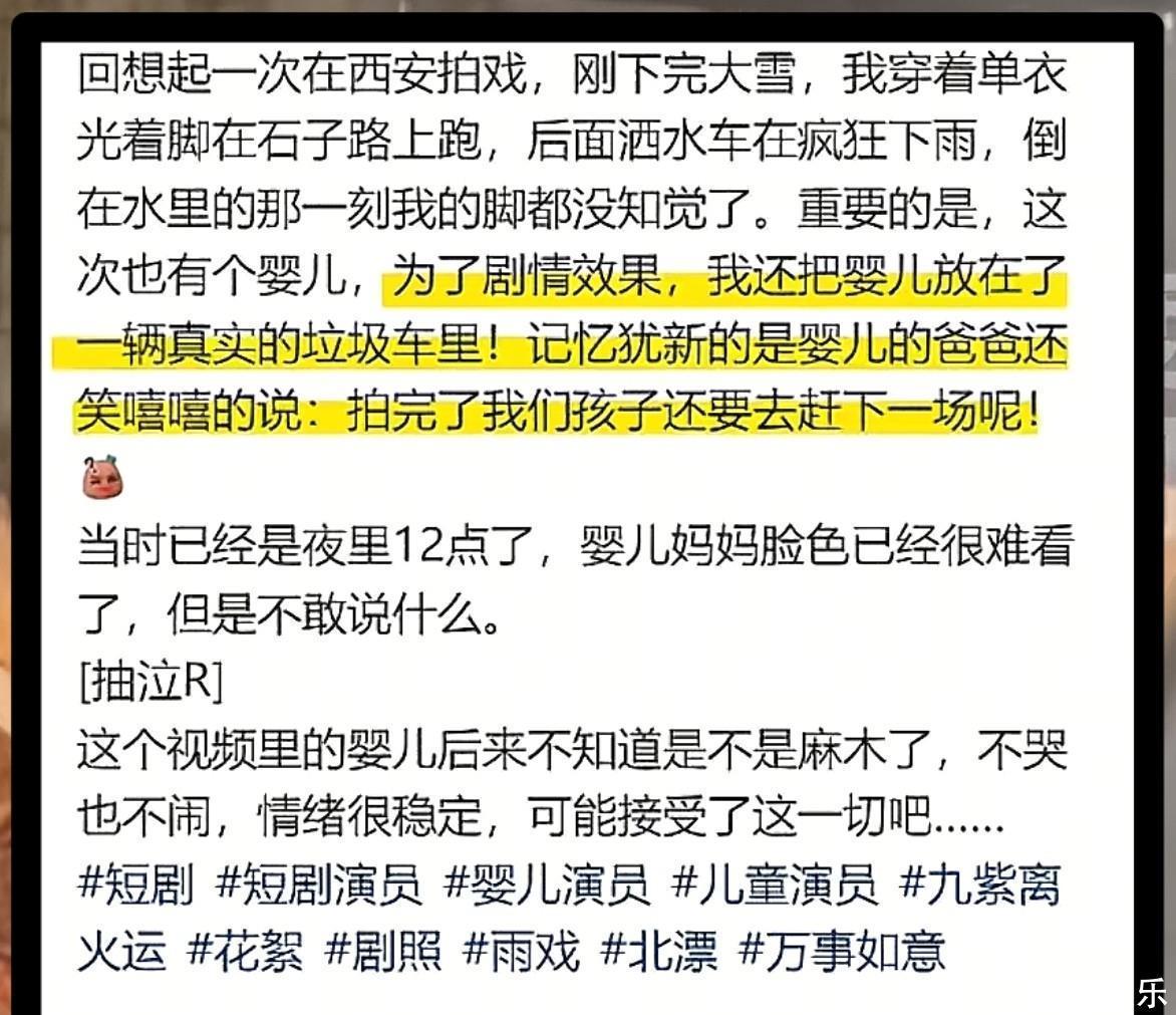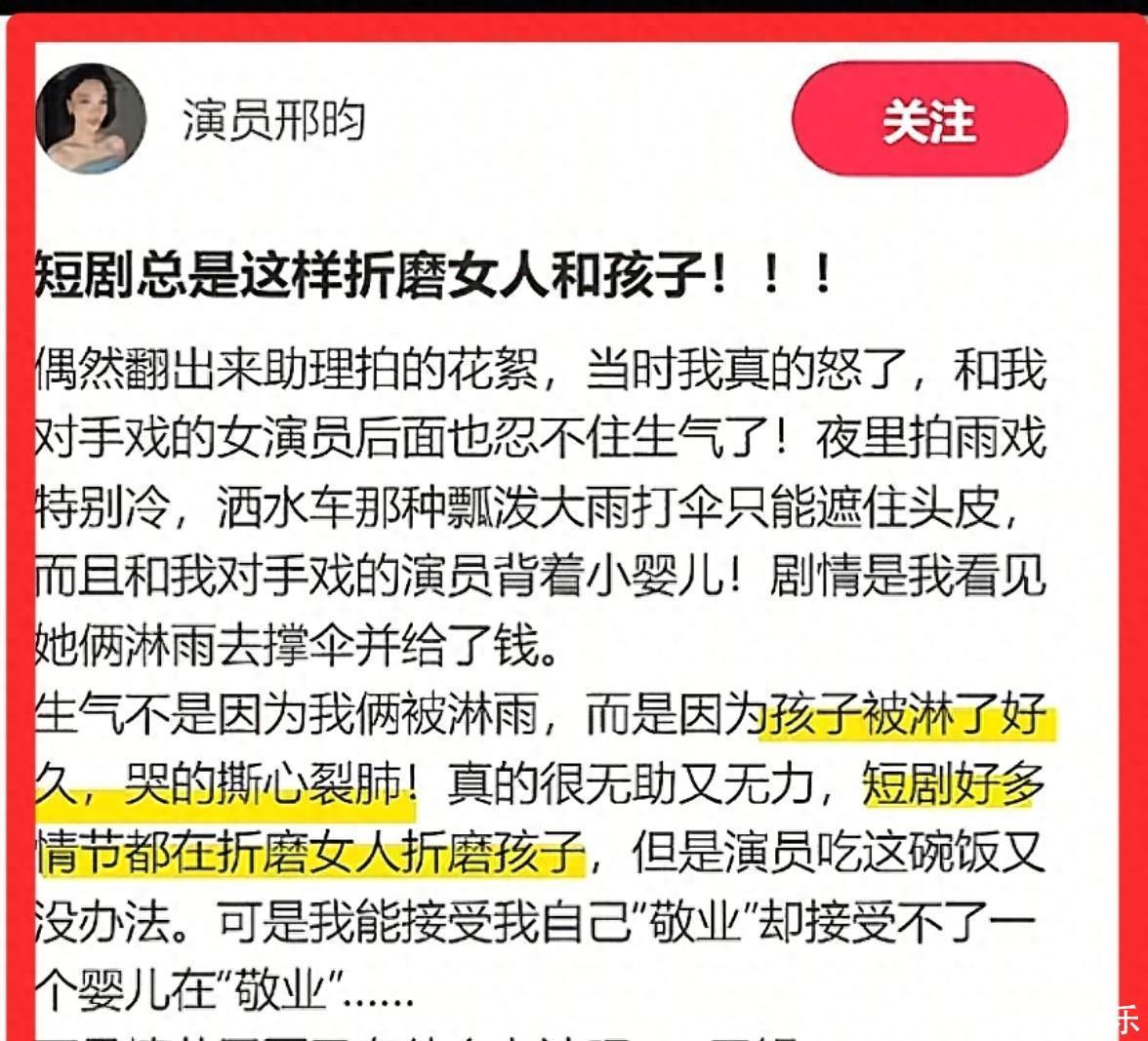 近日,短剧演员邢昀发文吐槽,剧组为了拍戏让婴儿一直淋雨,此事飞速冲上热搜,激励网友们的关爱。